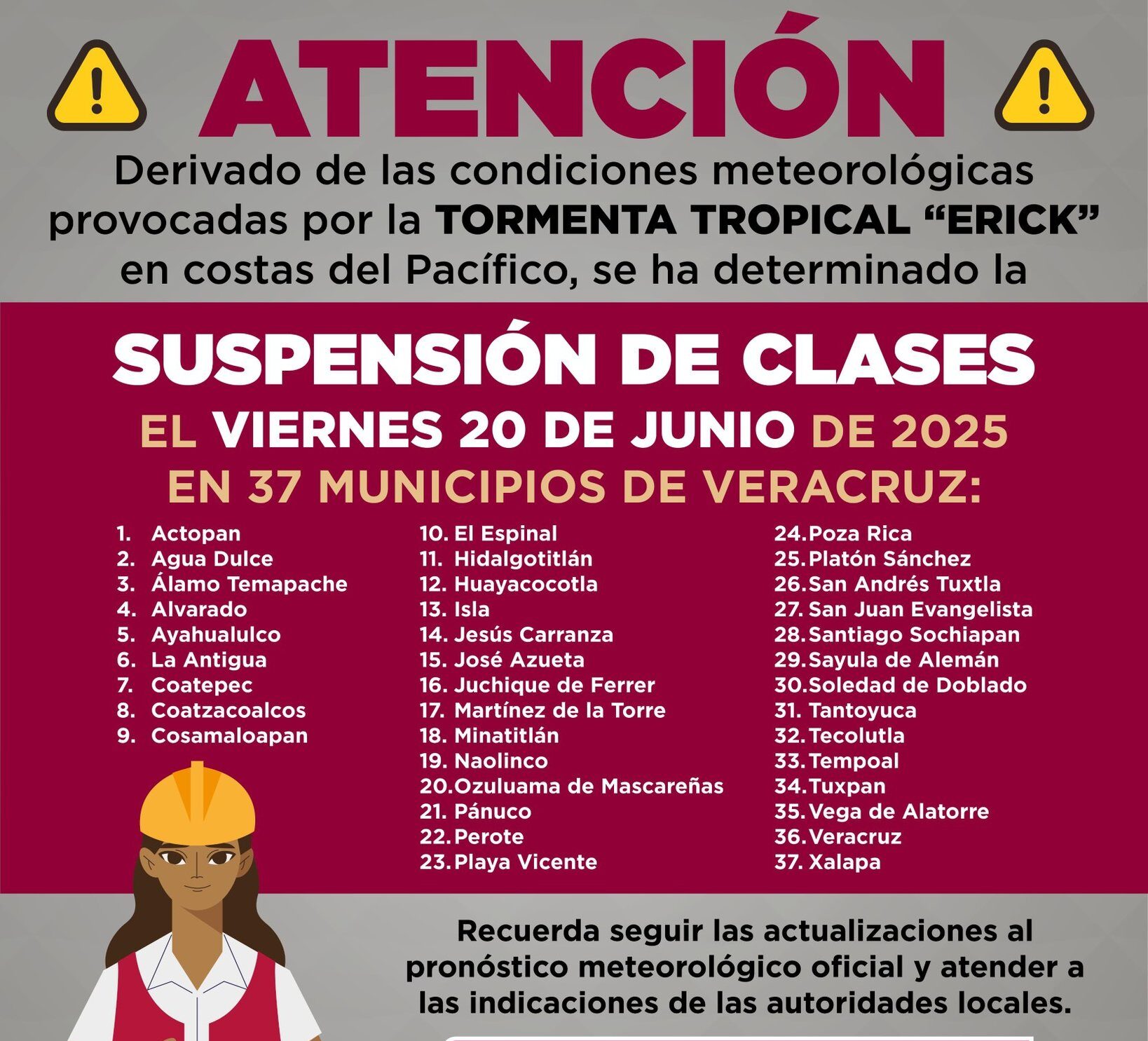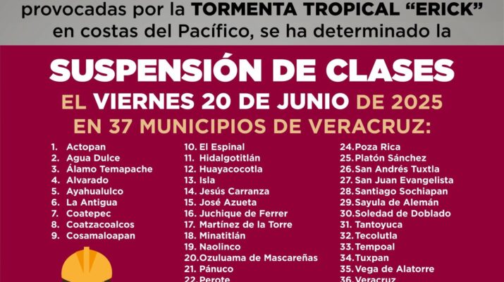 Xalapa, Ver., jueves 19 de junio de 2025. – En seguimiento al comunicado emitido esta noche, la suspensión de clases en Veracruz se amplía a 42 municipios, respecto a la medida inicial para 37, debido a las posibles afectaciones en planteles escolares ocasionadas por las lluvias intensas, inundaciones y deslizamientos provocados por la Tormenta Tropical Erick.
