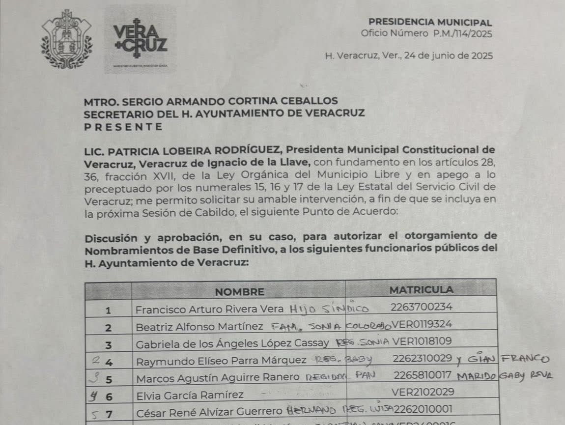 En un oficio enviado al secretario del ayuntamiento Sergio Cortina Ceballos, la alcaldesa de Veracruz propone que sean tomados en cuenta para obtener base laboral definitiva 32 empleados municipales allegados familiares y amigos incrustados en el actual gobierno.