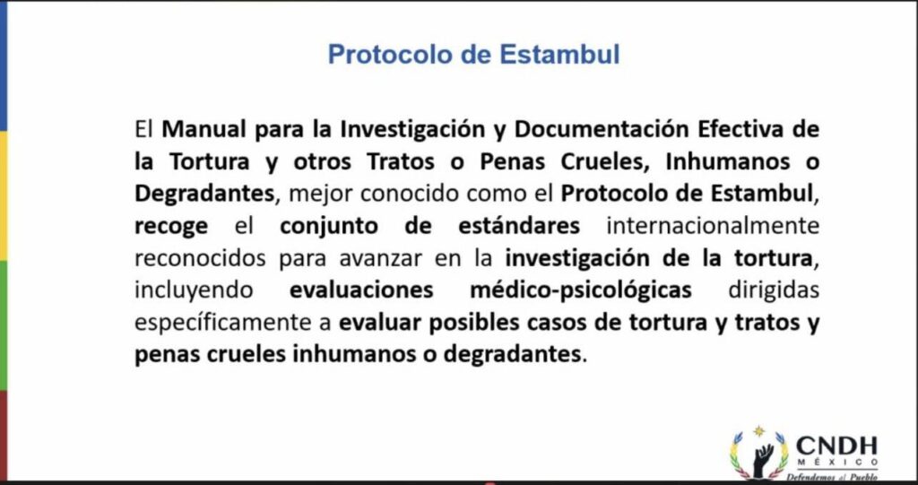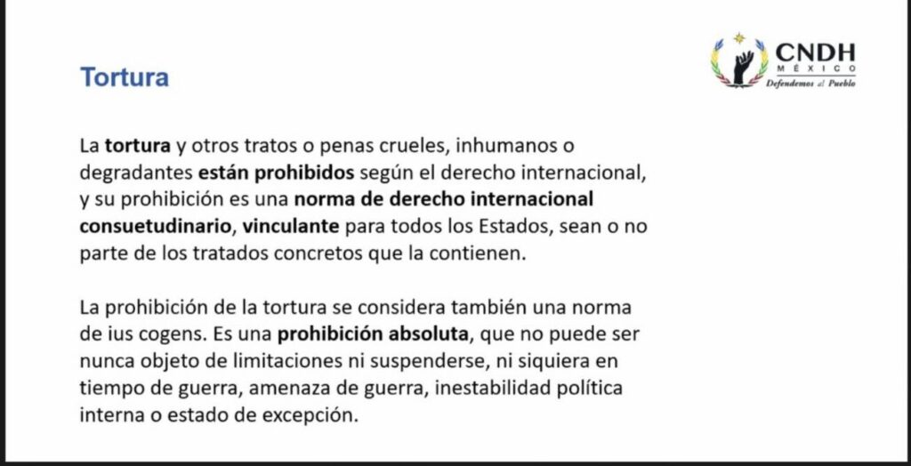 Durante la sesión, se abordaron los principales conceptos normativos, estándares internacionales y protocolos nacionales aplicables al trato digno de las personas, así como los mecanismos legales e institucionales para la investigación y sanción de actos de tortura, conforme al marco jurídico vigente y al Protocolo de Estambul.