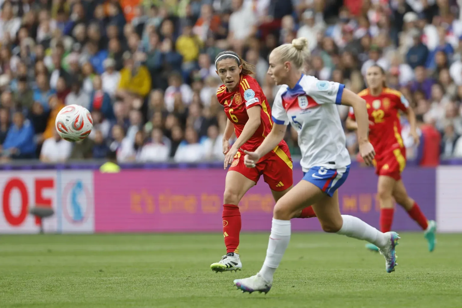 España se adelantó en el marcador en el minuto 25 con un testarazo de la delantera del Arsenal a pase de Ona Batlle, pero Inglaterra logró igualar la contienda también con un tanto de cabeza (m.57) en el encuentro que se disputa en Basilea (Suiza).