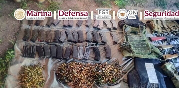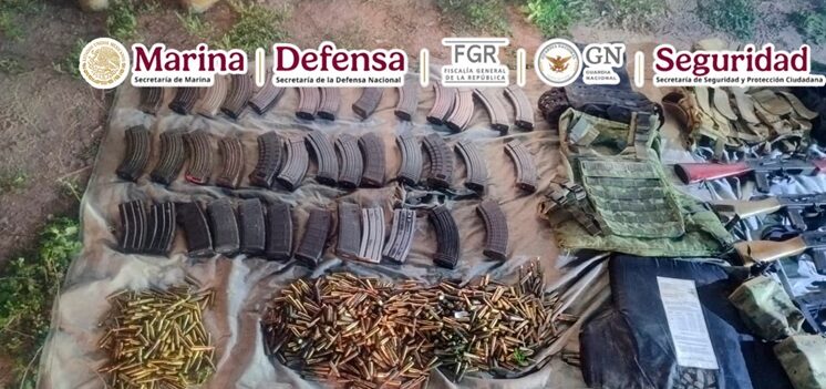 También, durante recorridos de patrullaje en el poblado Casas Viejas, del municipio de Elota, personal naval aseguró cuatro armas largas, 2,203 cartuchos de diversos calibres, 38 cargadores para diversos calibres, cuatro magazines, nueve placas balísticas, siete chalecos tácticos y dos paneles balísticos.