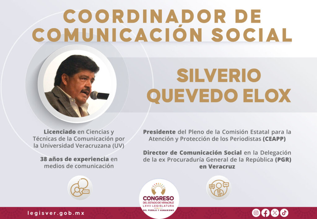 Silverio Quevedo Elox es licenciado en Ciencias y Técnicas de la Comunicación por la Universidad Veracruzana (UV). Tiene 38 años de experiencia en medios de comunicación. Inició en Editora la Voz del Istmo y en estaciones radiofónicas.