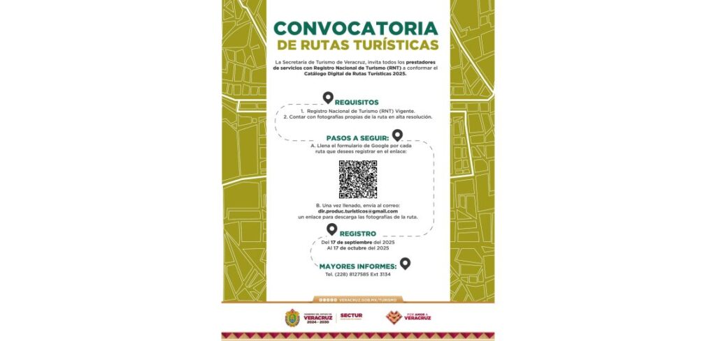 Xalapa, Ver., viernes 19 de septiembre de 2025.- La Secretaría de Turismo (SECTUR) abrió la convocatoria para integrar el Catálogo Digital de Rutas Turísticas 2025, con el propósito de impulsar la promoción de los destinos y atractivos turísticos de Veracruz.