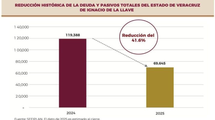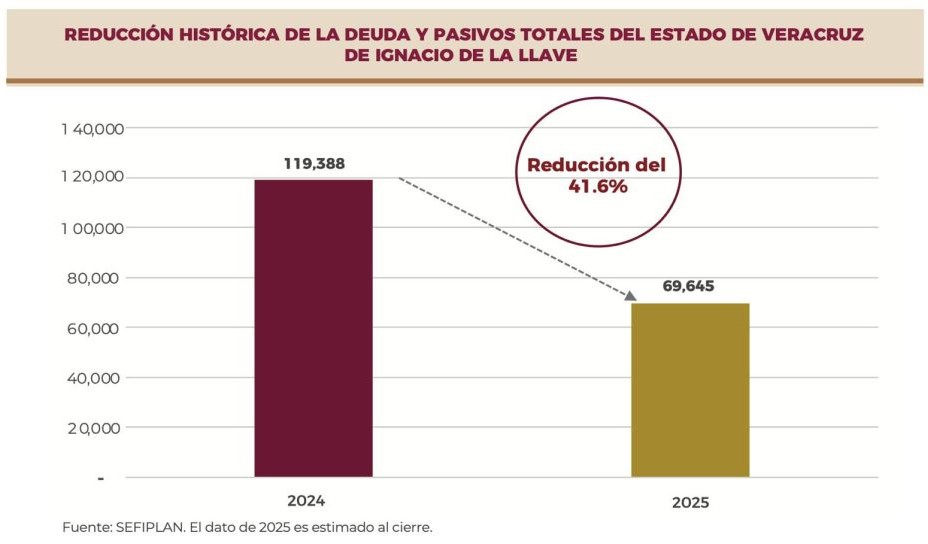Xalapa, Ver., martes 18 de noviembre de 2025.- La presidenta de México, Claudia Sheinbaum Pardo, reconoció el desempeño financiero del Gobierno de Veracruz encabezado por la gobernadora Rocío Nahle García, luego de que la entidad lograra una reducción histórica del 42 % en su deuda total, pasando de 119 mil millones a 69 mil millones de pesos en el primer año de administración..