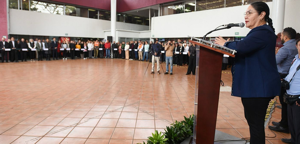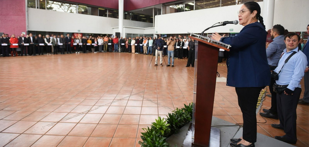 Al encabezar la ceremonia de Lunes Cívico en la explanada de las oficinas centrales de la dependencia, la titular de la SEV, Claudia Tello Espinosa, informó que estos avances corresponden al programa Transformando la Educación.