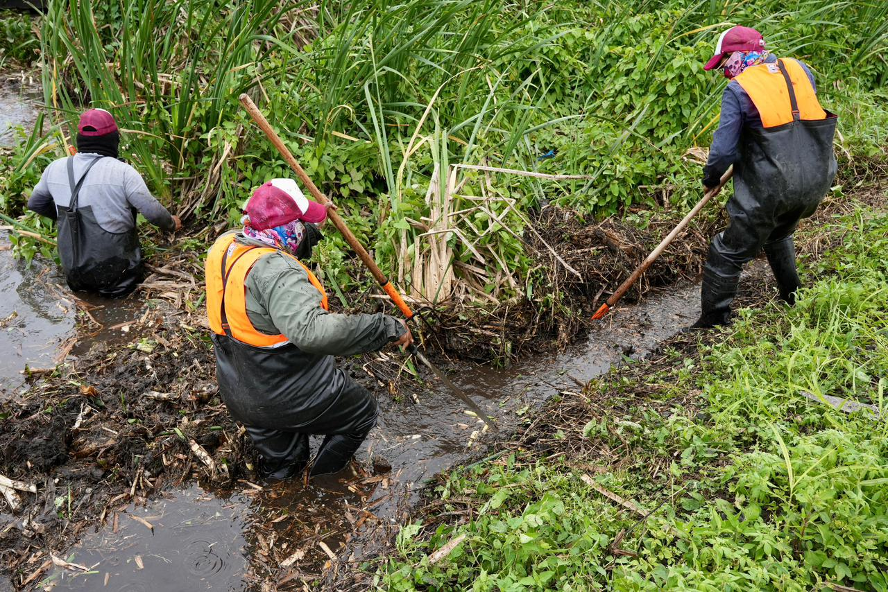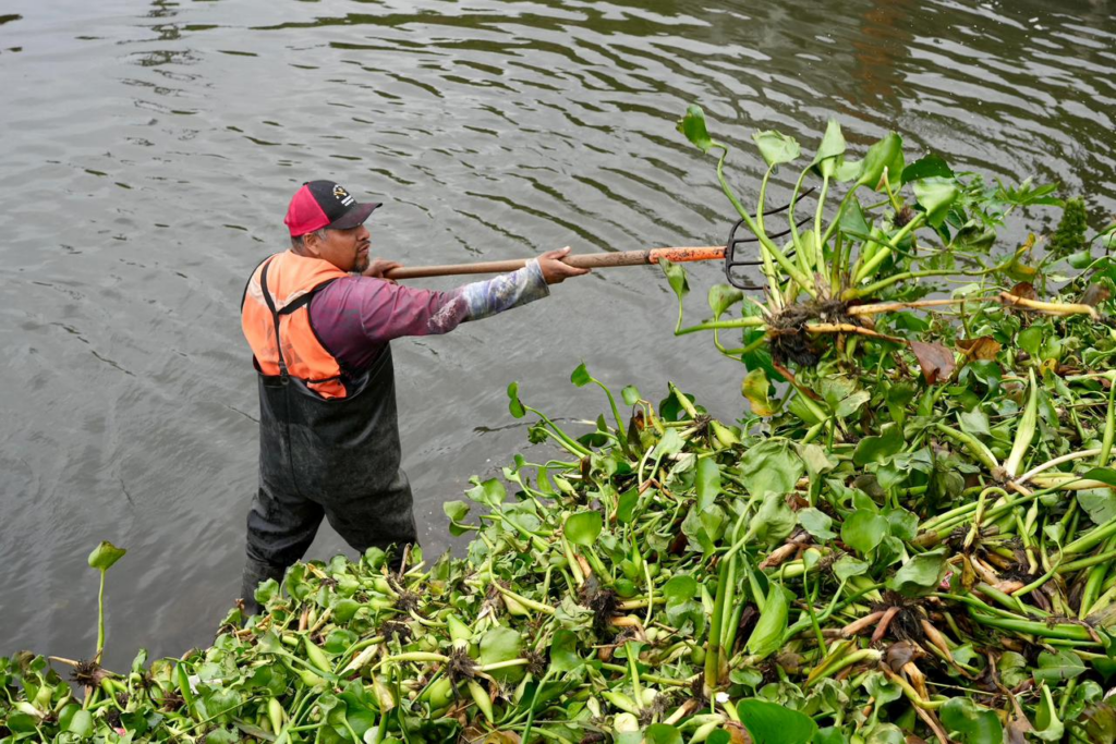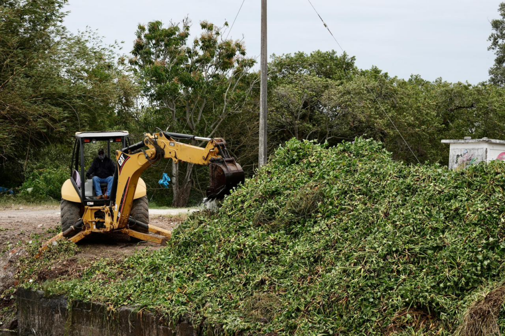 Las cuadrillas han realizado trabajos manuales y mecánicos con excavadoras para el retiro de lirio acuático, lechuguilla, oreja de elefante y maleza, así como limpieza de taludes, compuertas y desazolve en zonas críticas, además de 450 metros lineales de calles y cunetas en el Fraccionamiento Floresta, recolectando 14 metros cúbicos de basura orgánica, para evitar que obstruya los colectores y subcolectores.