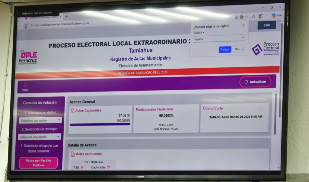 Xalapa, Ver., sábado 14 de marzo de 2026.- En seguimiento al Proceso Electoral Local Extraordinario 2026 (PELE 2026), la Consejera Electoral y Presidenta de la Comisión de Capacitación y Organización Electoral, Maty Lezama Martínez, supervisó, desde la Sala de Sesiones del Consejo General del Organismo Público Local Electoral del estado de Veracruz (OPLE Veracruz), el simulacro del Sistema de Cómputo Municipal que se realizó en la sede del Consejo Municipal de Tamiahua.