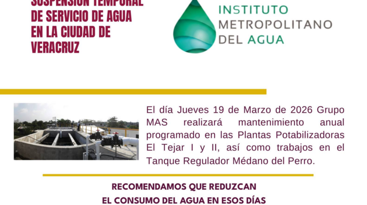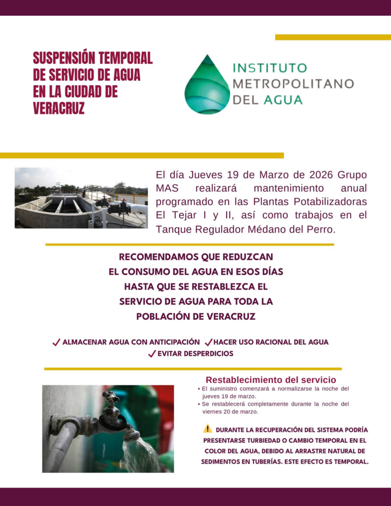 Veracruz, Ver., lunes 16 de marzo de 2026.- Debido al mantenimiento preventivo anual en las plantas potabilizadoras El Tejar I y II y en el tanque regulador Médano del Perro, el Instituto Metropolitano del Agua (IMA) exhorta a la ciudadanía a tomar previsiones ante la suspensión temporal del servicio de agua potable en toda la ciudad de Veracruz, el próximo jueves 19 de marzo, por lo que recomienda almacenar agua con anticipación y hacer un uso racional del vital líquido.
